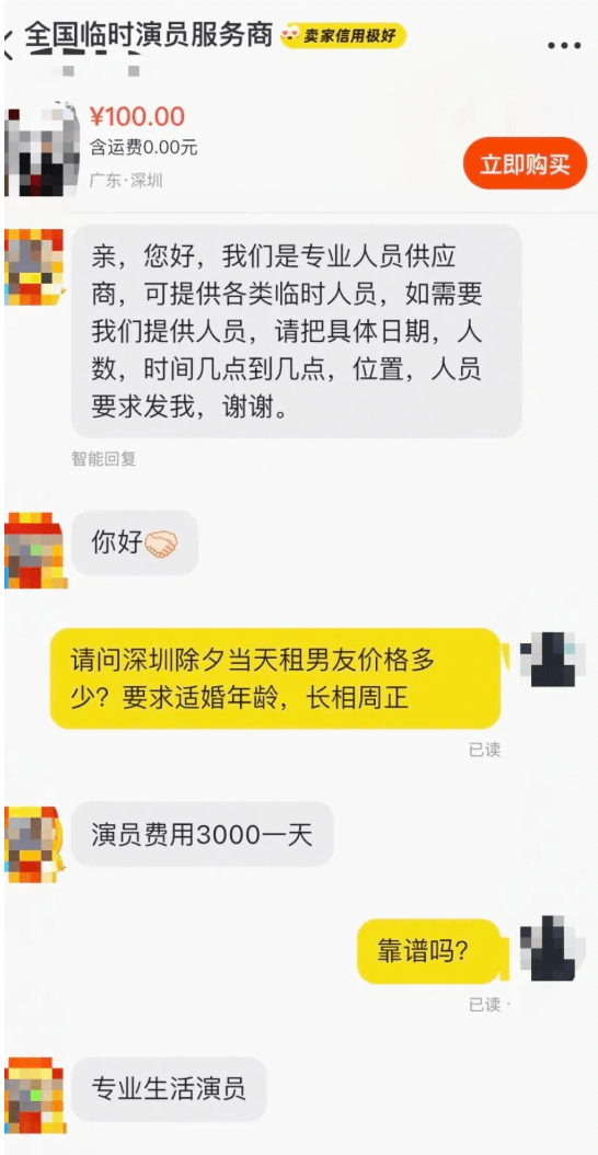 在某二手交易平台,多个商家挂出“专业演员假扮情侣”业务,其中一个商家的服务链接显示,已有180多人咨询,成功完成20余次服务。该商家声称是实体公司、支持对公收款,可在全国匹配演员,报价则要随地区、时长浮动,而除夕当天的报价最为惊人,一线城市最高可达一日3,000元,即便普通地区,单日价也不低于1,500元。商家表示“演员都是专业的”,至于交易方式,商家称“签不签合同都行”,只需先付定金,演员到场后结清尾款,全程走对公账户。