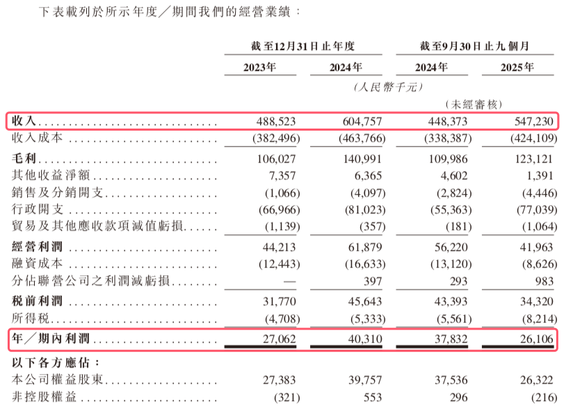 业绩方面,2023年、2024年以及2025年前九个月,锦欣康养收入分别约为4.89亿元、6.05亿元、5.47亿元;期内利润分别为2706.2万元、4031万元、2610.6万元。毛利率分别为21.7%、23.3%、22.5%。