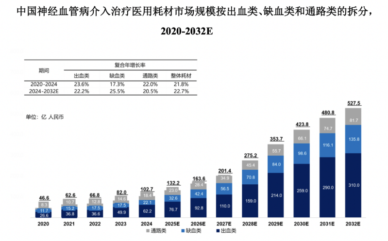 中国神经血管病介入治疗医用耗材市场由出血类、缺血类和通路类治疗耗材三大板块组成。随着国家医疗卫生的持续投入、居民支付能力提升以及人口老龄化趋势的加剧,脑血管病血管内介入治疗医用耗材市场规模快速地增长。2020年到2024年,中国神经血管病介入治疗医用耗材市场规模从46.6亿人民币增加到102.7亿人民币,复合年增长率为21.8%。预计到2032年中国神经血管病介入治疗医用耗材市场规模将达到527.5亿人民币,复合年增长率为22.7%。