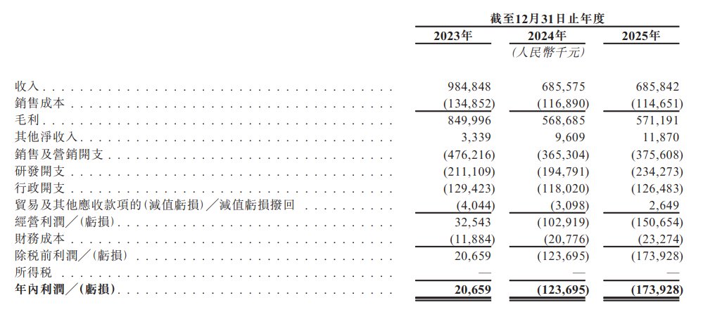 公司于2023年度、2024年度、2025年度分别录得收入约为9.85亿元、6.86亿元、6.86亿元人民币。