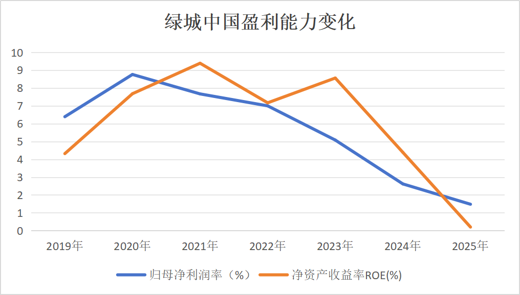 比规模收缩更令人警惕的,是盈利能力的持续恶化。绿城中国的归母净利润自2021年达到44.69亿元高点后,2023年降至31.18亿元,2024年几乎腰斩至15.96亿元,2025年更是跌至0.71亿元的历史性低点。与之对应,其间绿城整体毛利率从18.1%降至11.9%,归母净利润率从7.67%降至1.48%,摊薄ROE从9.39%降至0.20%,与国央企注重投资回报、严控运营风险的发展逻辑形成鲜明反差。