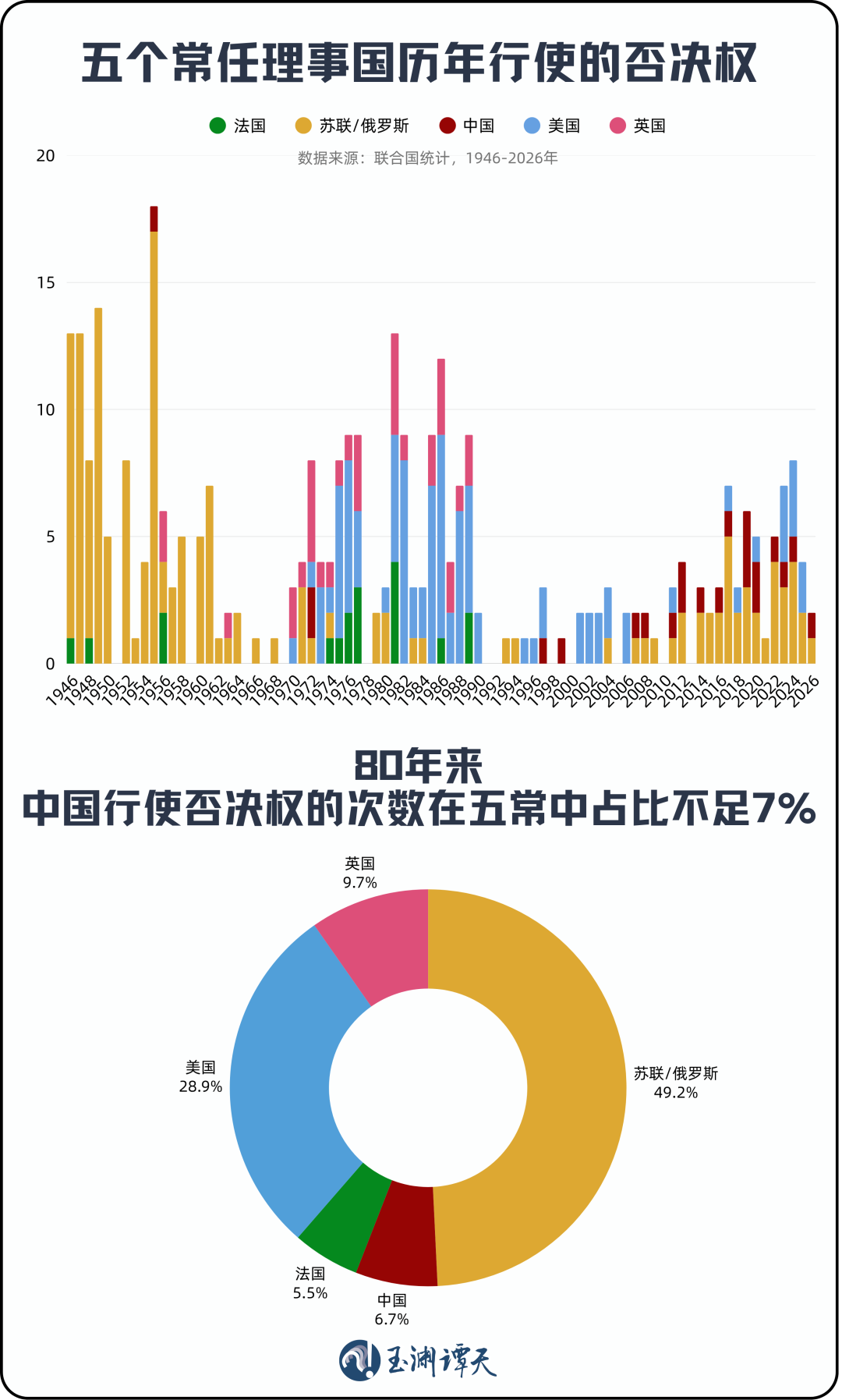 中国上一次行使否决权是在两年前,美国提出加沙停火决议草案的时候。根据联合国统计,历史上329次否决中,中国只占22次,占比不足7%。