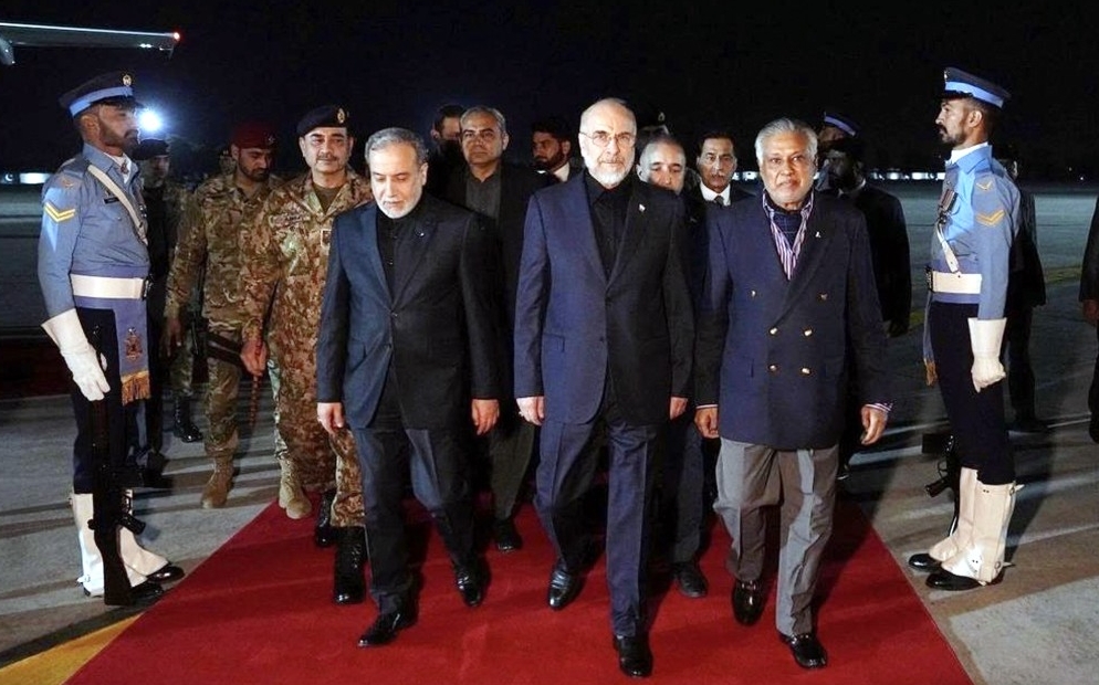 ▲传伊朗方面同意与美国重启谈判,图为国会议长加利巴夫(中)率领的伊朗代表团成员。新华社