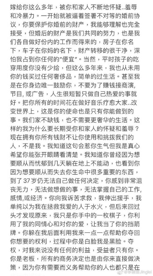 2.李靓蕾在多年的婚姻生活里被王力宏及其家人怀疑、羞辱、冷暴力,被迫签定不平等的婚前协议,而婚后财产则被转移至王力宏本人及其家人名下;