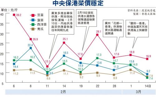 多名跨境货车司机染疫后,致使文锦渡口岸接连暂停跨境货车进出,以阻隔患者及密切接触者,许多运菜车因而滞留口岸,供港蔬菜未能如常抵港。由于蔬菜来货量减少,蔬菜批发价比平时高了不少,因此当时市民只能无奈捱贵菜。所幸中央及广东省果断採取措施,充分保障特区的蔬菜及生活必需品供应。随后特区政府与内地在2月底更开通了水路运输、跨境铁路货运列车等多种运输方式,确保内地能够源源不绝地向香港提供支援,各项运输方式于3月初起已全面启用,菜价亦随之回落。根据特区政府公布,3月14日,内地经陆路和水路抵港的蔬菜供应量约2,100公吨,与平日内地供应量相若,蔬菜价钱已回复平稳。