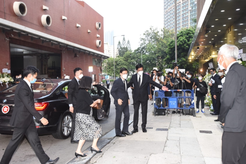 保安局前局长李少光上月离世,今晚(11日)于红磡世界殡仪馆设灵,多名政商界名人到场吊唁,包括前特首曾荫权、政协常委唐英年、港大校委会前主席李国章、警务处处长萧泽颐等。至傍晚时分,特首李家超与太太、前律政司司长兼基本法委员会前副主任梁爱诗、前全国人大常委范徐丽泰等亦到场。