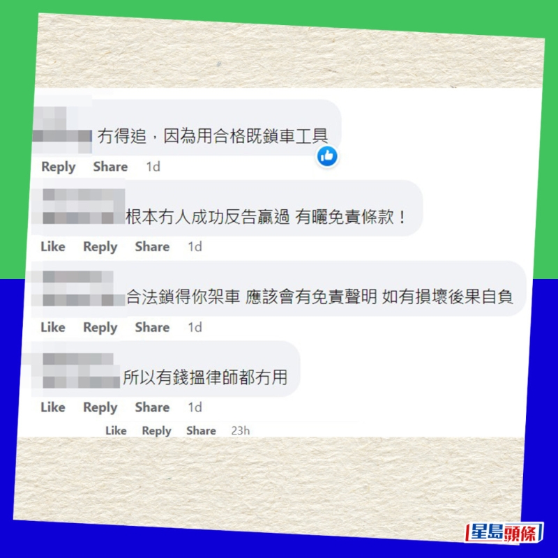 大律师陆伟雄接受本网记者查询时表示,“我畀你锁车,唔代表你破坏㗎车”,因此锁车时若因不专业“粗手粗脚”或疏忽而“整花”了汽车,亦需赔偿,就算锁车公司有免责条款,亦难逃赔偿责任。不过,陆伟雄指出,车主实际索偿时亦要提出如车cam片等证据。