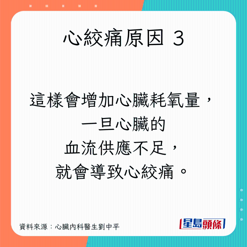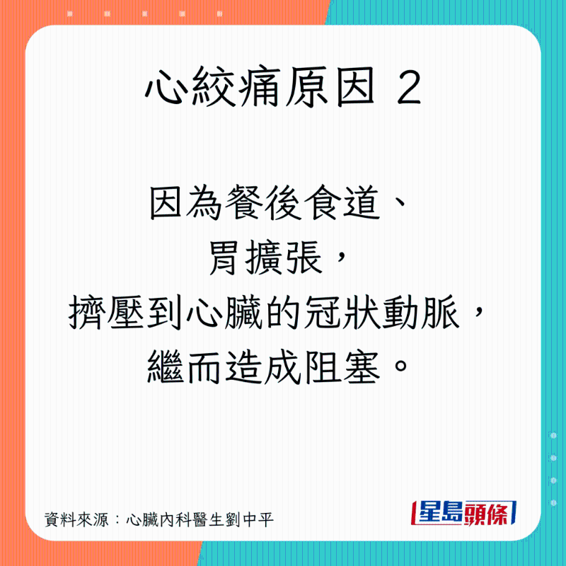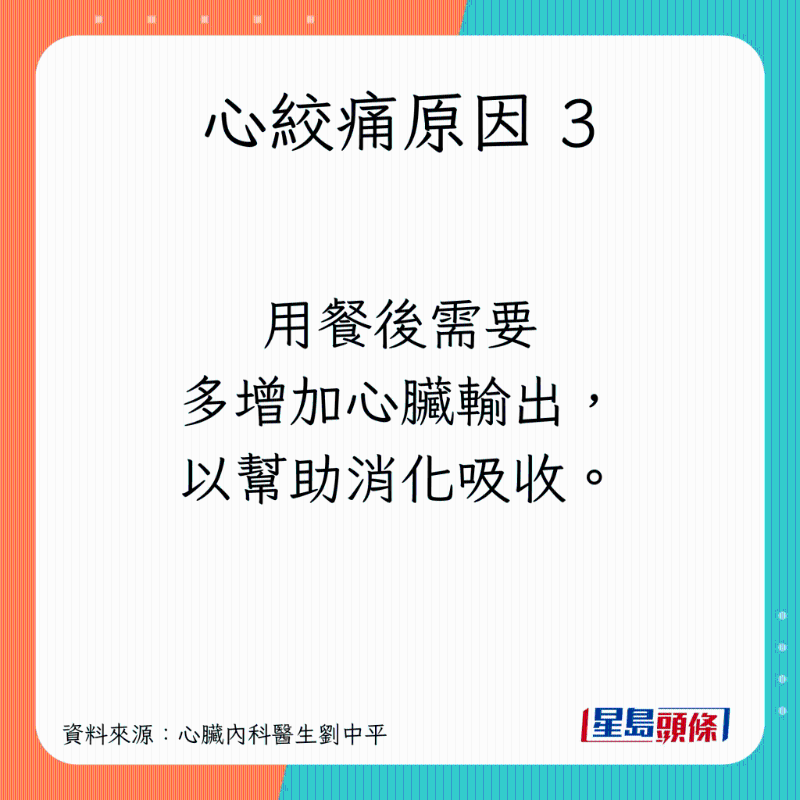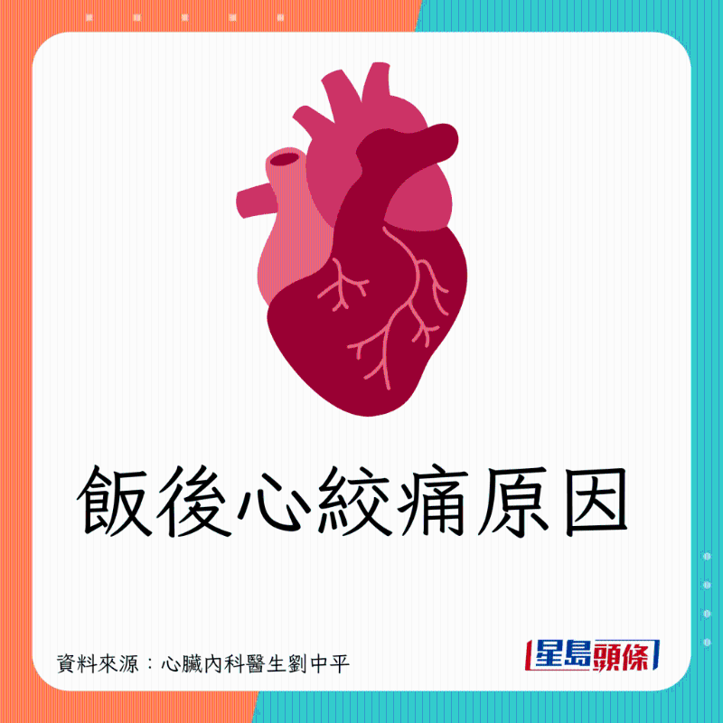 刘医生指出,若确定肠胃没问题,吃饱饭之后感到胸痛时,就要留意一件事:是否由严重的冠状动脉狭窄所引起的心绞痛。他引述研究指,饭后心绞痛患者,较易出现主干或多条的冠状动脉病变,亦经常会在休息期间感到心绞痛。原因有以下3个: