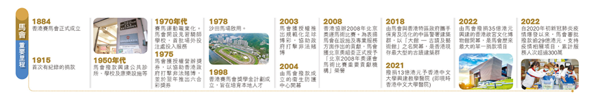 香港赛马会(“马会”)成立于1884年,是致力建设更美好社会的世界级赛马机构。马会透过其结合赛马及马场娱乐、会员会所、有节制体育博彩及奖券,以及慈善及小区贡献的独特综合营运模式,创造经济及社会价值,并协助政府打击非法赌博。马会是全港最大的单一纳税机构,也是香港主要雇主之一,其慈善信托基金位列全球十大慈善捐助机构。