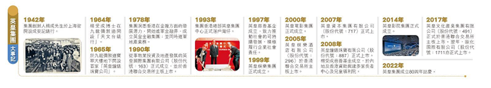 英皇集团的品牌历史要追溯到1942年,由集团主席杨受成博士父亲杨成先生创立“成安记表行”开始。时至今日,英皇集团已发展成为拥有六间香港上市公司的多元化综合企业集团,业务涵盖地产、金融、钟表珠宝、娱乐文化、酒店、数码媒体及生活品味等,陪伴香港成长至今逾八十年。