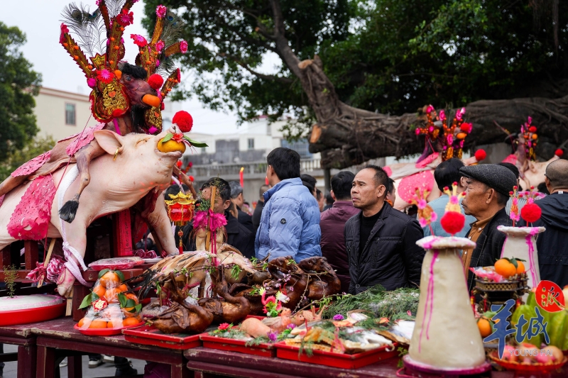 当天凌晨五点,“赛大猪”现场人山人海,“丁头”人家在村里太保爷宫前用特制的木架架起大猪,猪的嘴巴里含着桔子,寓意大吉大利,背上贴着红色的“喜”字,有些大猪背上还叠上一只小羊,俗称“全副猪羊”,祈求幸福安康。