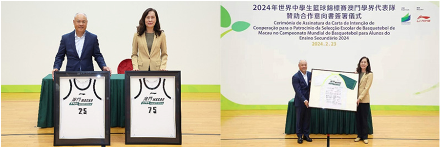 澳门特别行政区政府社会文化司司长欧阳瑜女士向李宁先生致送一件由澳门特区政府代表、澳门学界运动员和教练签名的球衣;李宁先生致送了两件印有75号和25号的球衣,以表达共同庆贺中华人民共和国成立75周年,澳门回归祖国25周年,极具纪念意义。