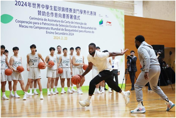 作为签约仪式的特别环节,德维恩·韦德先生及教练团队为澳门学界篮球代表队开展了一场特别训练课,与学界代表队进行互动和交流。球员们完成了热身后,韦德耐心示范动作,观察并指导球员的技术动作。韦德先生将职业赛场的经验传递给年轻球员,用榜样的力量激励年轻一代通过运动发现潜力,传承不服输、敢拼搏的体育精神,帮助青少年树立走向更大的比赛舞台的目标。
