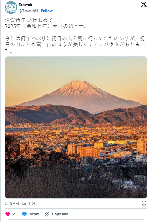 日本网友也纷纷分享今天清晨朝圣富士山元旦第一道日出的超美成果。