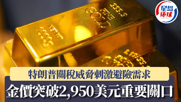 在美国总统特朗普加征关税的威胁下,市场避险需求持续,令金价越升越有,再创历史新高,最新报2,954美元。有分析人士指出,若金价持续突破2,950美元,将为黄金延续过去两个月形成的上升趋势奠定基础。