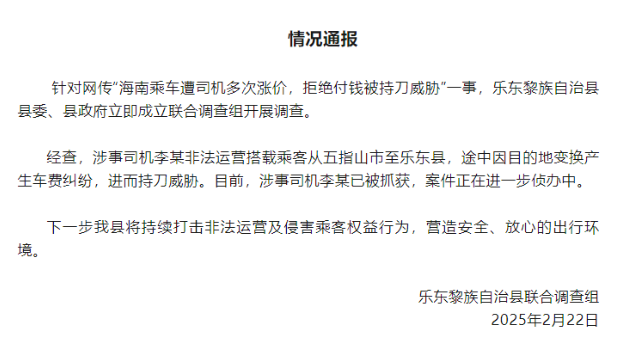 2025年2月21日,我局关注到网络上有乘客反映“海南乘车遭司机多次涨价,因拒绝付钱被司机持刀威胁”的情况,已经主动联系该乘客,并根据乘客提供的线索,组织协调县公安局、县综合执法局等部门对涉事车辆、司机及相关运营行为开展全面核查。下一步,将依据调查结果依法依规作出处理,并公开处理结果。