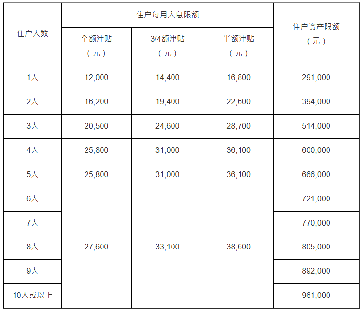 视乎住户入息,基本津贴、中额津贴、高额津贴以及儿童津贴会以全额、3/4额或半额发放。