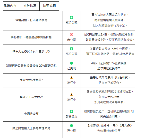 反移民和压通胀,是特朗普竞选时的主打项目,且是他赢得低下阶层支持的关键原因之一。报道指,特朗普上任后宣布美墨边境进入“国家紧急状态”,严格管控非法入境,使得边境越境人数在百日内降至数十年新低,兑现核心承诺。但另一方面,他承诺实施大规模遣返行动,却因预算、人手及移民法庭积压等问题,未能达到预期速度。