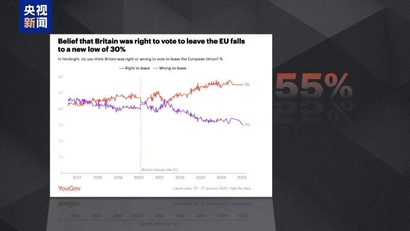 今年1月,在英国“脱欧”五周年之际,民调机构舆观(YouGov)的调查数据显示,高达55%的受访者认为英国“脱欧”是一个“错误”,只有约30%的人认为英国通过公投“脱欧”是正确之举。