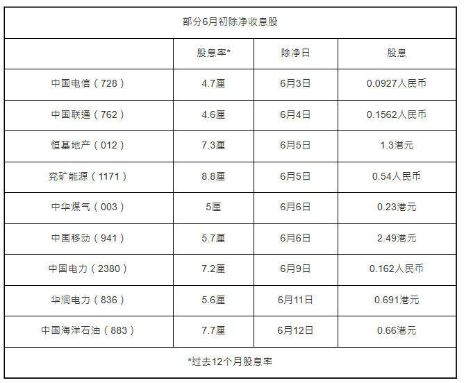 港元定期存款利率近日低至1厘水平,发钞行定存息更失守1厘,不少“食息一族”惟有寄望收息股“生性”让其可以“财息兼收”,皆因多只收息股6月初先后除净,包括中资电讯股的中国电信(728)、中国联通(762)及中国移动(941),本地公用股如煤气公司(003)等。每年不少股民会趁股份除净前入货,除净后博股价上升再沽出,这条“赚息又赚价”的方程式,今年能否成功?