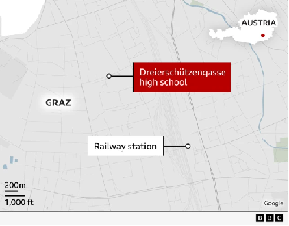 ▲图中红框指示地为事发学校,该校距离格拉茨市火车站不远。英国广播公司(BBC)称,格拉茨是奥地利第二大城市,距离首都维也纳约200公里。图源:BBC