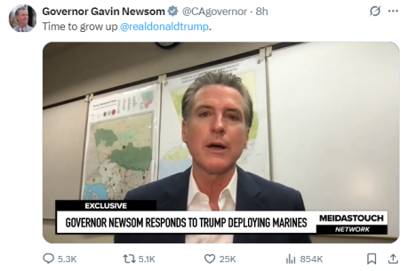 当天,纽森在社交媒体上发布了一条自己接受采访回应“特朗普派遣国民警卫队应对抗议者”的视频。视频中,纽森表示,“这就是为什么我告诉总统赶快结束这件事,逮捕我吧,向前看。如果你想找人开刀,那就对我这样做吧”。