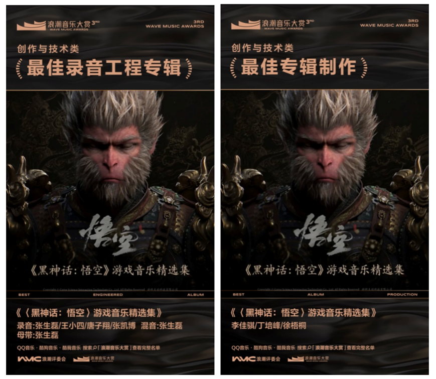 此外,《黑神话:悟空》游戏音乐精选集,作为游戏的衍生音乐作品,凭借其精良的录音品质与制作水准,同时获得了最佳录音工程专辑与最佳专辑制作两项创作与技术类荣誉。