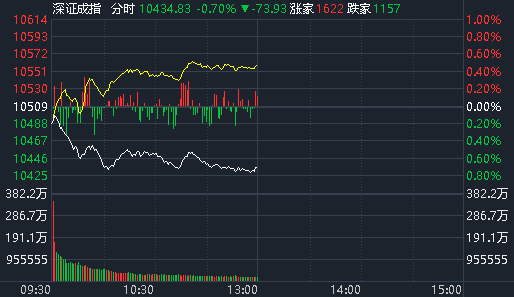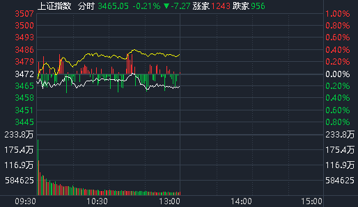 截至午间收盘,沪指报3465.05点,跌0.21%;深成指报10434.83点,跌0.70%;创指报2129.34点,跌1.25%。