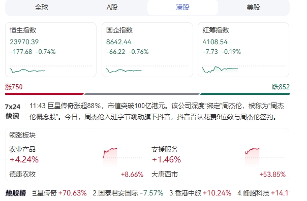 港股通板块中,“周杰伦概念股”巨星传奇(06683)盘中涨逾100%,早盘收涨70%。消息面上,抖音相关负责人回应“周杰伦入驻抖音”表示,账号属实,但针对网传的抖音花费9位数与周杰伦签约传言为谣言。
