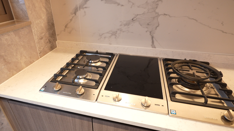 ▲厨房工作枱面上配备德国Miele电磁炉﹑单头及双头煤气炉。