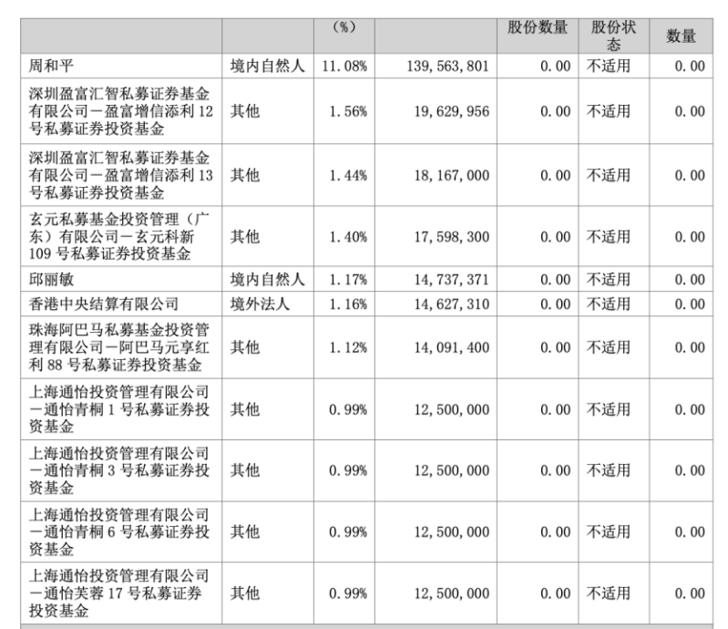 截至2025年3月末,周和平及其一致行动人合计持有公司15.04%股份。
