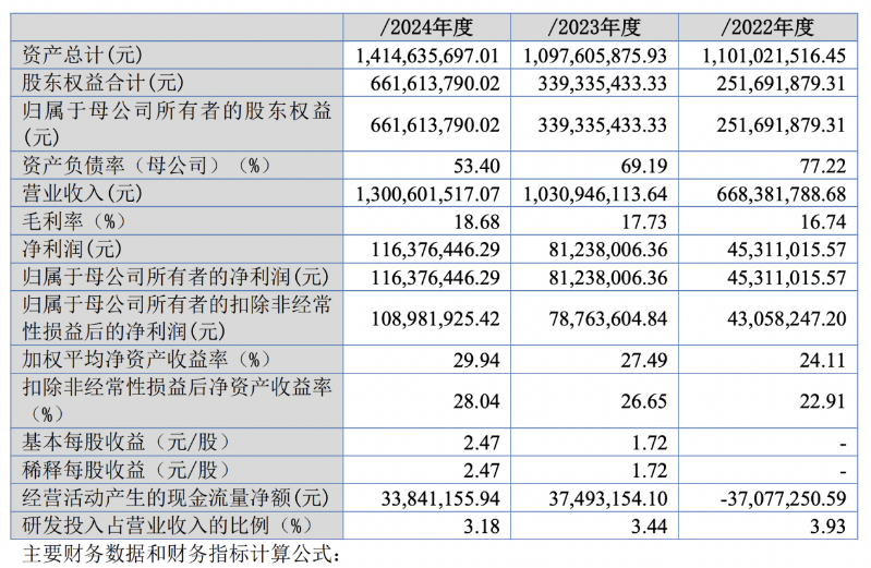 2022年至2024年,朗信电气营业收入分别为6.68亿元、10.31亿元和13.01亿元,净利润4531.10万元、8123.80万元和1.16亿元,毛利率分别为16.74%、17.73%和18.68%。
