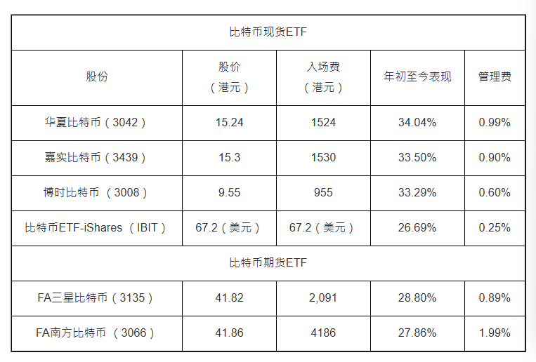 博时比特币(3008)的入场费最低,目前仍不足千元。该ETF每手100股,以周一收报9.55元计,入场费955元,同样追踪芝商所CF比特币指数(亚太收市价),资产规模达15.15亿,管理费为0.6%。若以年初至今计,该ETF录得33.3%升幅。