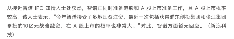 而据新浪报道,智谱正同时准备港股和A股上市准备工作,且A股上市概率较高。