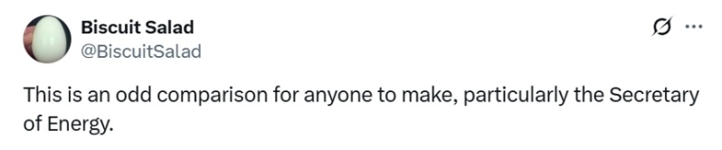 还有网友说,“对任何人来说,作出这样的比较都很奇怪,尤其是对能源部长来说。”