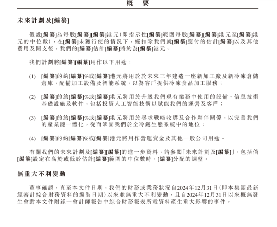招股书指出,此次募集资金将用作以下四个用途:一是将用于未来三年建造一座新加工厂及新冷冻仓储、仓库;二是用于升级现有设备及软件,包括投资人工智能技术等;三是将用于寻求战略收购及合作伙伴关系,以完善产业链一体化;四是补充营运资金及其他一般公司用途。