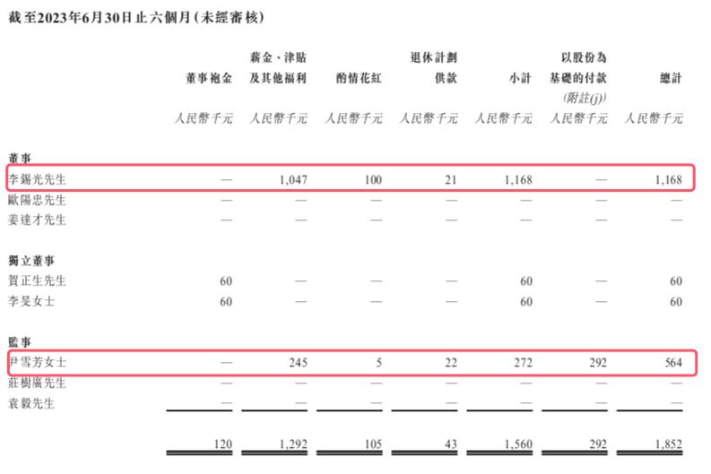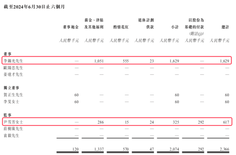 据瑞财经查阅,2024年上半年,公司披露的董事及监事薪酬由去年同期的185.2万元涨至236.6万元。其中,李锡光涨薪39%至162.9万元,监事尹雪芳涨薪9%至61.7万元。
