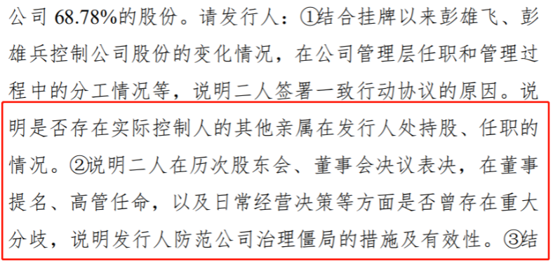 根据申请文件,彭雄飞、彭雄兵为公司的控股股东、实际控制人,二人签有一致行动协议,分别直接持有公司34.39%的股权,合计控制公司68.78%的股份。彭雄飞、彭雄兵为兄弟。