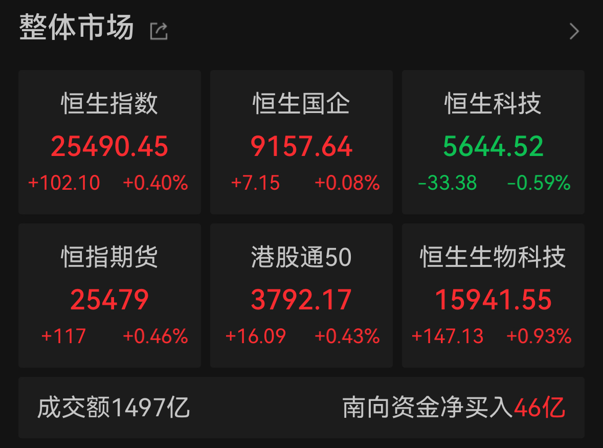 据新浪财经7月28日消息,港股三大指数冲高回落。截至午间收盘,恒生指数涨0.4%,报25490.45点,恒生科技指数跌0.59%,国企指数涨0.08%。