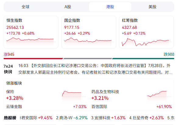 据新浪港股7月28日消息,港股三大指数冲高回落。截至收盘,恒指收涨0.68%,科指收跌0.24%,国企指数涨0.29%。