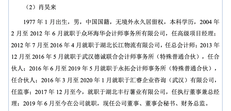 肖昊来,1977年1月出生,男,中国国籍,无境外永久居留权,本科学历,2004年2月至2012年6月就职于众环海华会计师事务所有限公司,任高级项目经理;2012年7月至2016年4月就职于湖北长江物流有限公司,任总会计师;2013年12月至2016年5月就职于武汉德诚联合会计师事务所(特殊普通合伙),任合伙人;2016年6月至2019年5月就职于永拓会计师事务所(特殊普通合伙),任合伙人;2016年3月至2020年1月就职于汇睿企业咨询(武汉)有限公司,任监事;2017年12月至今,就职于湖北丰行薯业有限公司,任执行董事兼总经理;2019年6月至今在公司就职,现任公司董事、董事会秘书、财务总监。