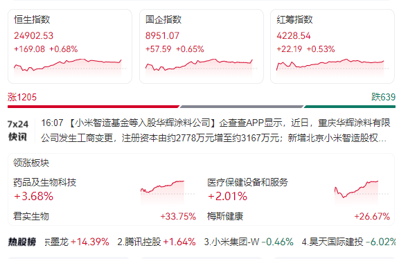 8月5日消息,港股三大指数集体上涨。截至收盘,恒生指数(24855.15, 121.70, 0.49%)涨0.68%,报24902.53点,恒生科技指数(5509.66, 28.41, 0.52%)涨0.73%,国企指数涨0.65%。盘面上,科网股涨跌不一,联想涨超5%,哔哩哔哩、快手涨超2%,小米集团跌幅居前;生物医药概念股走强,君实生物(31.1, 7.04, 29.26%)涨超33%;钢铁股涨幅居前,马鞍山钢铁股份(2.48, 0.29, 13.24%)涨超15%;苹果概念走高,比亚迪电子(35.36, 2.48, 7.54%)涨超7%;汽车板块回调,蔚来跌超6%。