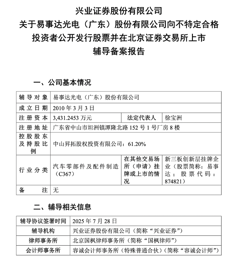 近日,易事达光电(广东)股份有限公司(以下简称“易事达”)启动IPO辅导,拟登陆北交所。