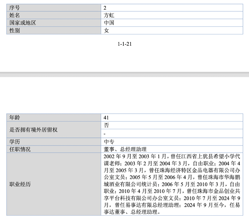 方虹,41岁,中专学历,其于2002年9月至2003年1月,曾任江西省上犹县希望小学代课老师;2003年2月至2004年3月,自由职业;2004年4月至2005年3月,曾任珠海经济特区金品电器有限公司办公室文员;2005年5月至2006年4月,曾任珠海市华海鹏城酒业有限公司统计员;2006年5月至2010年3月,自由职业;2010年4月至2010年7月,曾任珠海市金品创业共享平台科技有限公司办公室文员;2010年7月至2024年9月,曾任易事达有限总经理助理;2024年9月至今,任易事达董事、总经理助理。