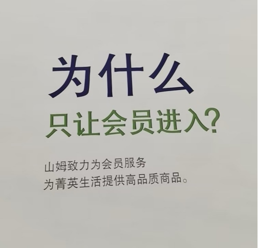 在社交媒体,有人将山姆称为“中产五件套”之一。每一家山姆超市的入口处,都张贴着标榜自身价值观的标语。其中最醒目的就是“为什么只让会员进入?”而答案就印在下方——“山姆致力于为会员服务,为菁英生活提供高品质商品。”