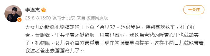 有《功夫皇帝》之称、现年62岁的国际武打巨星、金像影帝李连杰宣布荣升做外父。 昨日(9日)李连杰在微博发文:“大女儿的新婚礼物搞定咯! 下单了智界R7。 她跟我说,特别喜欢这车,样子好看,合眼缘,里头坐着还挺舒服,用着也省心,我这当老爸的听着心里也就踏实了。 礼物嘛,女儿真心欢最重要! 现在就盼着早点提车,这样小两口儿就能带着我这老爸出去溜溜弯儿了~”