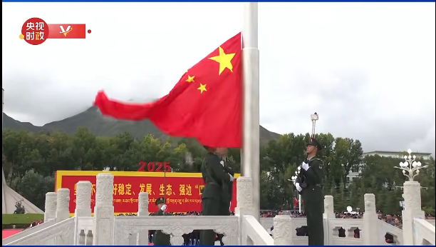 现场全体起立,高唱国歌。鲜艳的五星红旗在布达拉宫广场冉冉升起。