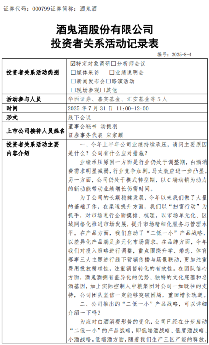8月4日,酒鬼酒发布投资者关系管理信息公告显示,7月31日,由华西证券、嘉实基金、汇安基金等 5 人进行特定对象调研,公司董事会秘书汤振羽、证券事务代表宋家麒接待,双方围绕业绩承压情况、“二低一小”产品战略、与胖东来合作情况、内参经营策略、2024年公司净利率较低原因五个方面进行交流。