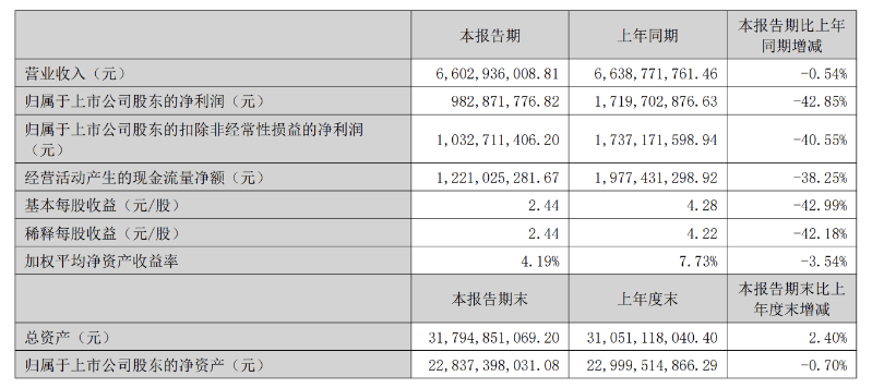 2025年上半年,长春高新营业收入为66.03亿元,同比减少0.54%;归属于上市公司股东的净利润为9.83亿元,同比减少42.85%;经营活动产生的现金流量净额12.21亿元,同比减少38.25%。