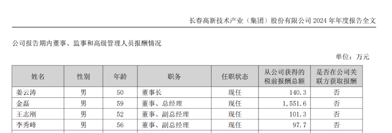 瑞财社查阅,长春高新总裁由60岁金磊担任,其自2024年6月24日被选举为董事,自2024年09月27日被聘任为总经理。2024年年报显示,金磊薪酬为1551.6万元